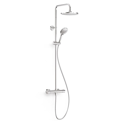 Colonne thermostatique CALIDA de chez TRES - Avec inverseur intégré dans le régulateur de débit. Volants ronds en ABS. Pommeau de douche orientable ABS 250mm Douchette à main anti-calcaire 110mm avec 3 jets Flexible Silverliss. En savoir plus »